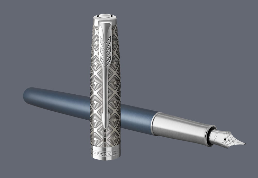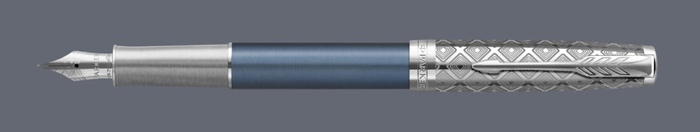 Korpus wykonany ze stali szlachetnej pokryty lakierem w kolorze niebieskim zabezpieczony matowym werniksem. Skuwka stalowa, polerowana, wytrawiana chemicznie w geometryczny wzór. Elementy wykończeń platerowane palladem. Osłona sekcji stalowa, delikatnie szczotkowana. Stalówka w rozmiarze F (cienka) wykonana z 18-karatowego złota platerowana rodem. Produkt objęty Gwarancjami Królewskimi.