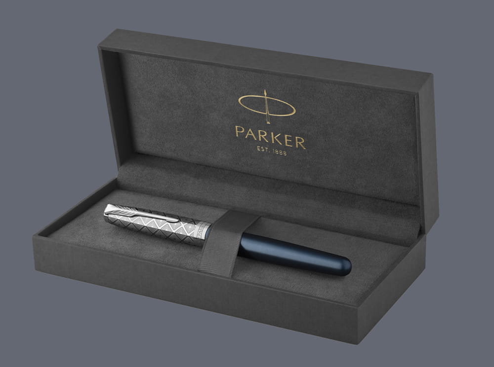 Produkt stanowi zestaw składający się z pióra wiecznego, pudełka Parker Premium, dwóch nabojów startowych oraz tłoczka Deluxe.